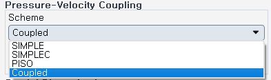 Scheme의 Coupled는 압력과 속도를 동시에 계산할 수 있는 설정입니다.